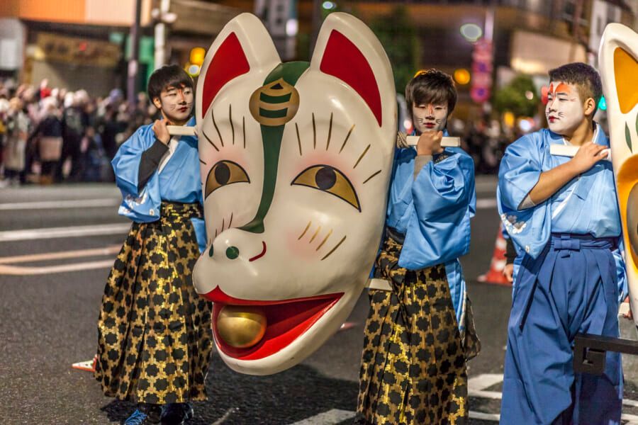 Điểm nhấn của lễ hội là cuộc diễu hành đặc sắc mô phỏng truyền thuyết “bầy cáo kéo về đền Oji Inari” để cầu chúc năm mới an lành. Người tham gia sẽ hóa trang thành những chú hồ ly trắng với mặt nạ Kitsune, khoác lên mình những bộ trang phục truyền thống và diễu hành qua các con phố trong ánh sáng mờ ảo của đèn lồng.